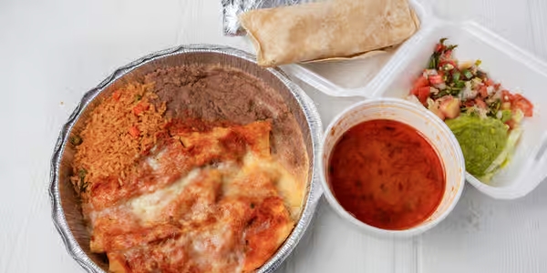 Three enchiladas filled with shrimp and topped with a spanish sauce and cheese. Served with rice and beans.